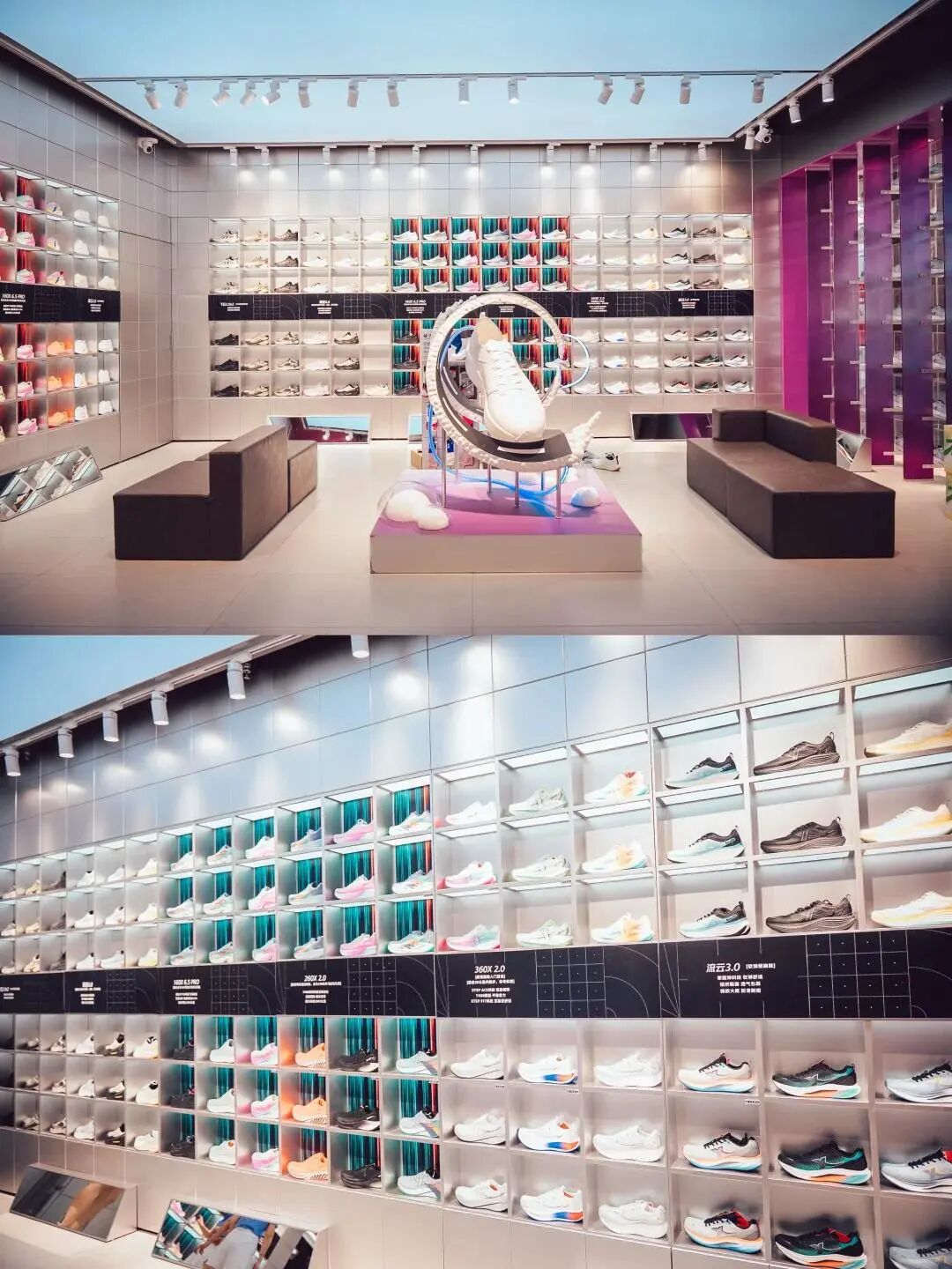 空间设计,科技质感与潮流调性融合。特步紫标店产品涵盖跑步、户外、综训等男女装产品一应俱全。整个门店以紫色为主色调,大面积金属质感鞋墙+嵌入式灯光,搭配中心悬浮鞋装置,强化产品展示的视觉冲击力,凸显高端定位。