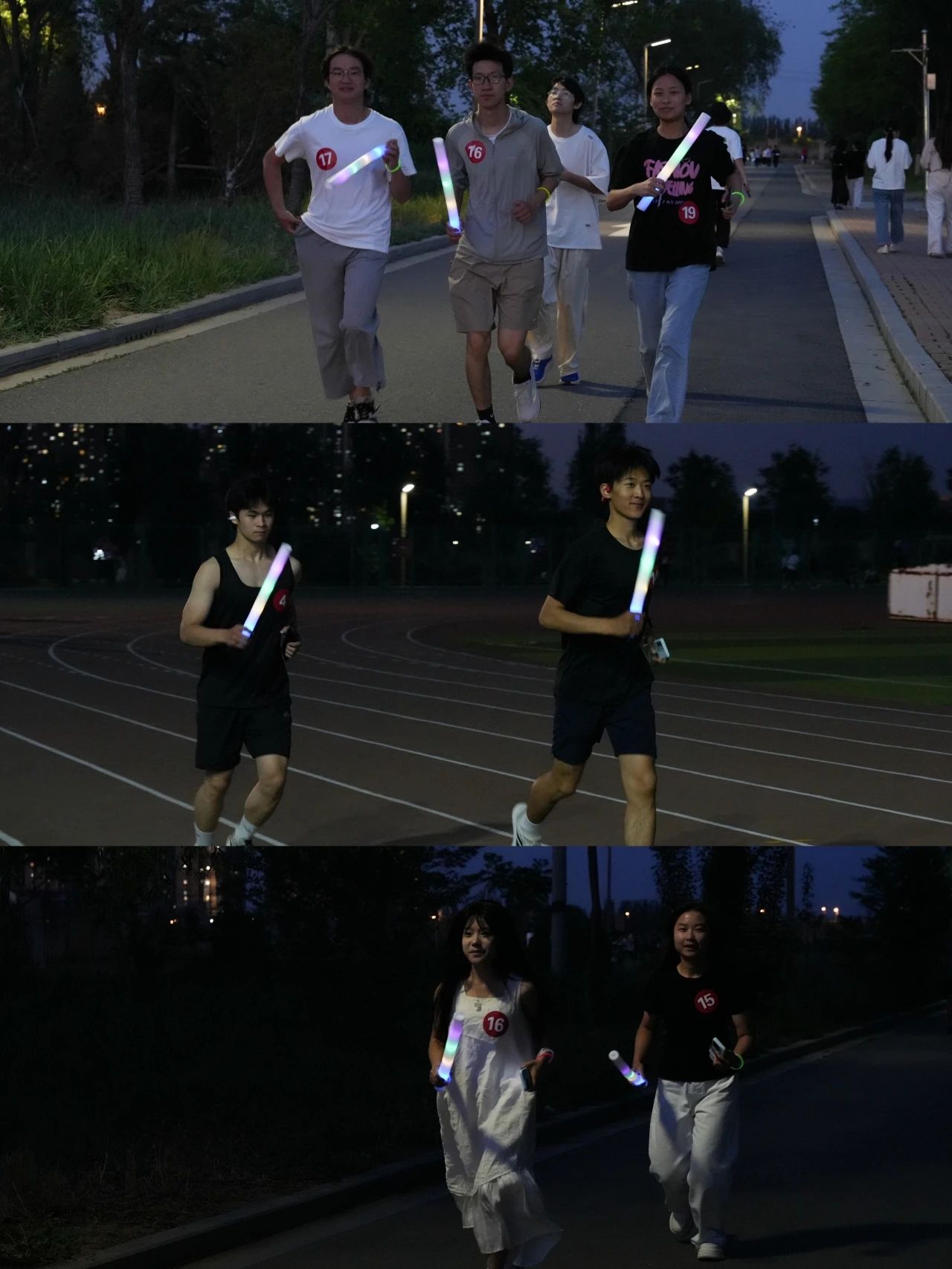夜跑活动开始前,同学们身着运动衫,佩戴荧光手环、手拿荧光棒,化身“追光少年”,热身结束后,在出发点有序列队集结。
